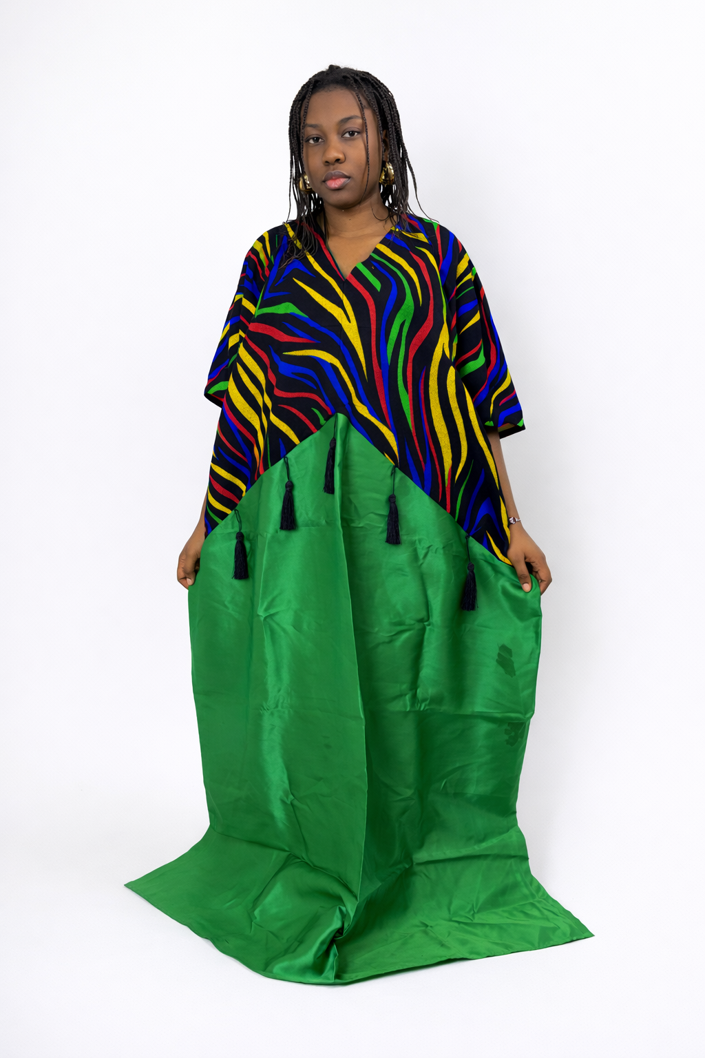 Elevate your wardrobe with a piece that defines “maximalist elegance.” This striking floor-length gown features a high-contrast V-neck bodice adorned with a vibrant, multi-colored zebra motif in primary hues. The design transitions into a sweeping emerald green skirt with a unique chevron seam, highlighted by delicate black tassels for added movement and texture. Perfect for high-profile events or luxury lounging, this kaftan is a masterclass in bold color-blocking.
